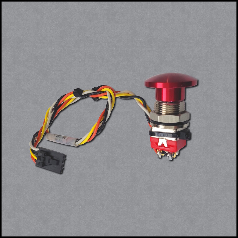 Red push-pull mushroom style e-stop switch assembly ~ has wire harness p/n 178-01578-0004 ~ Details; 4-wires, colors: White-BlackYellow-Orange ~ terminates to a 4-pin black color plug